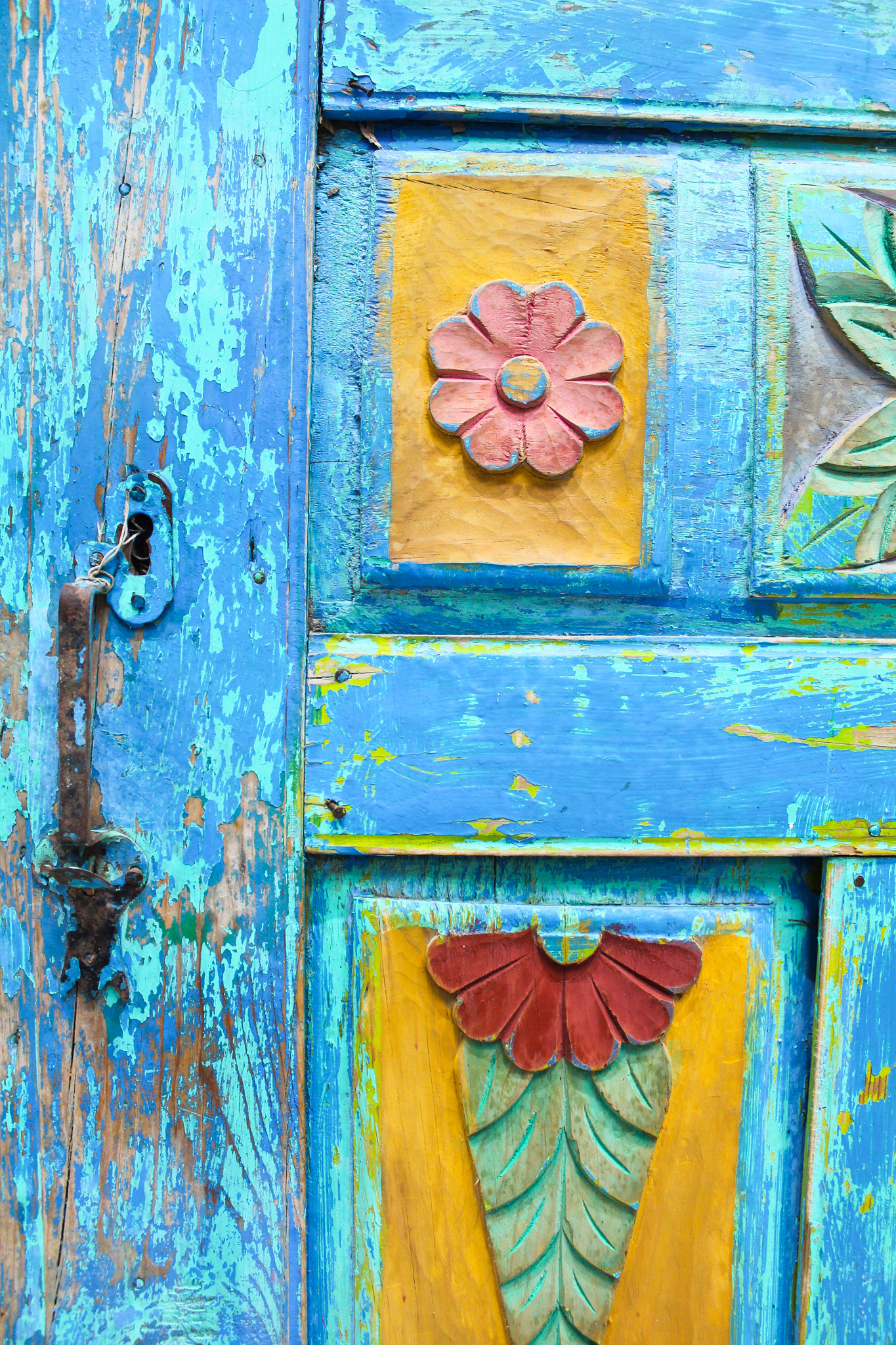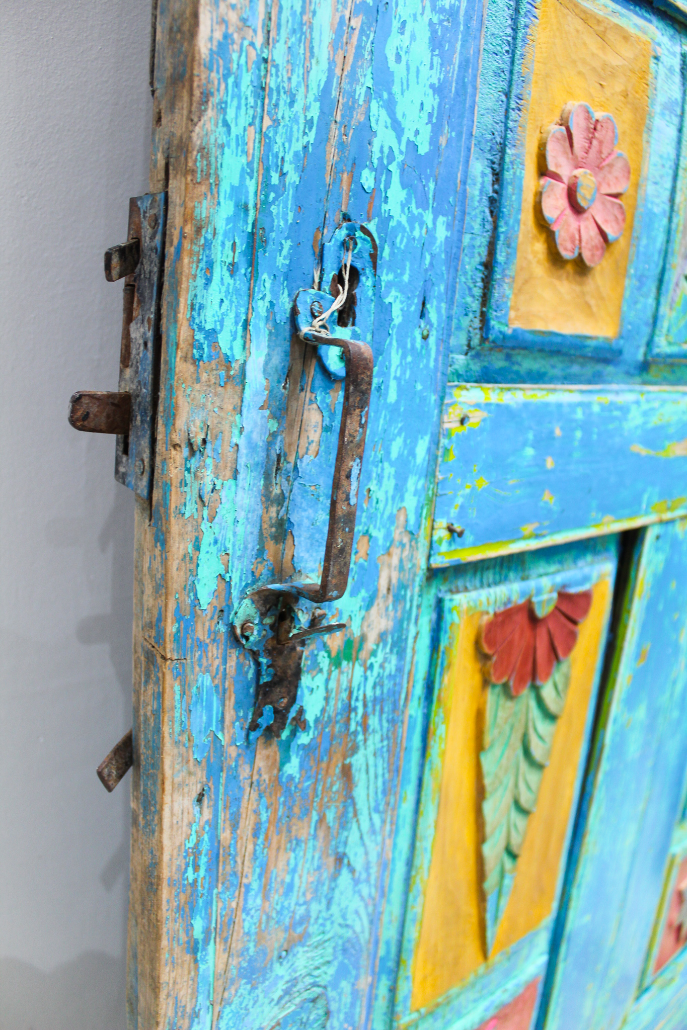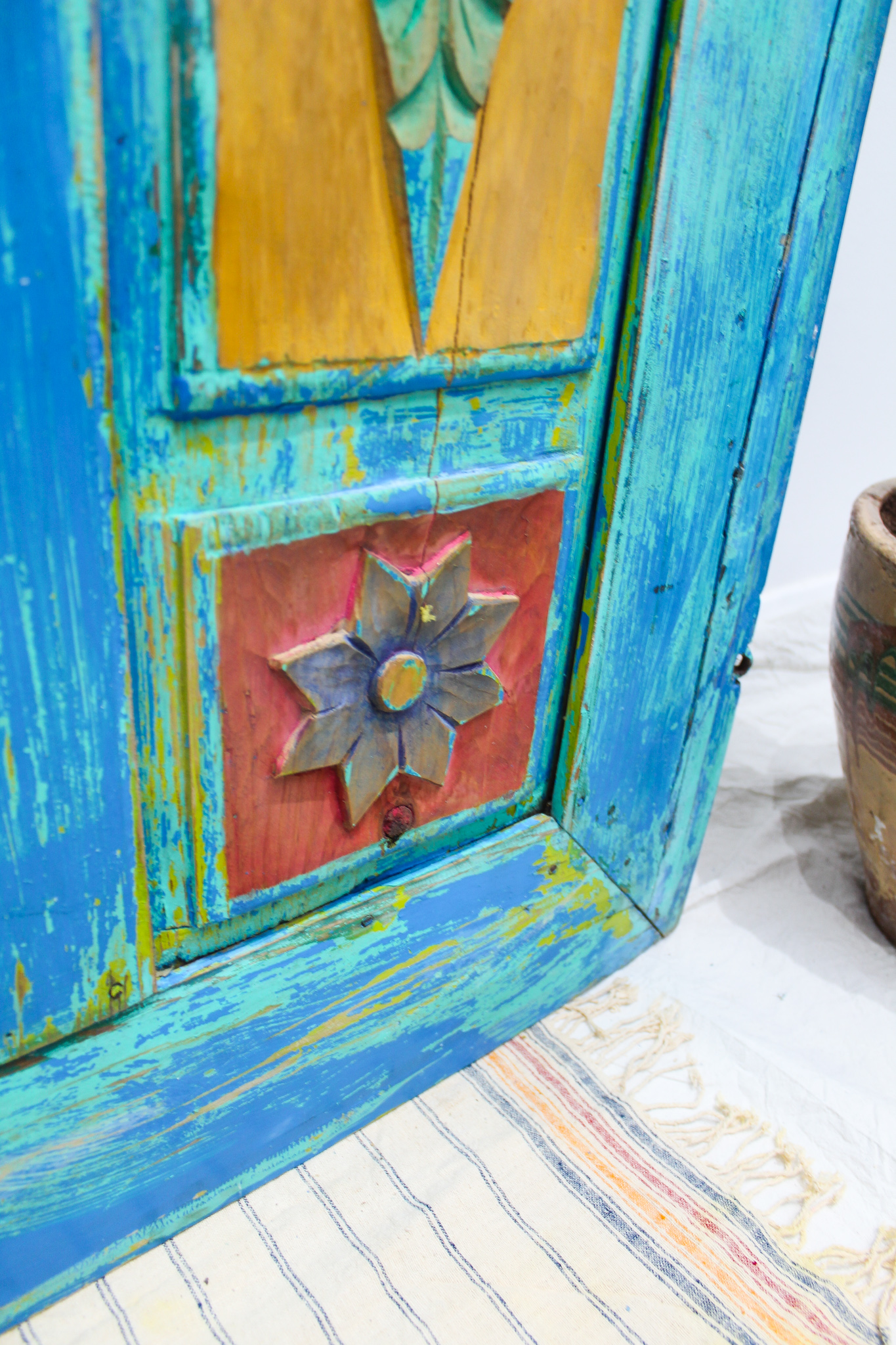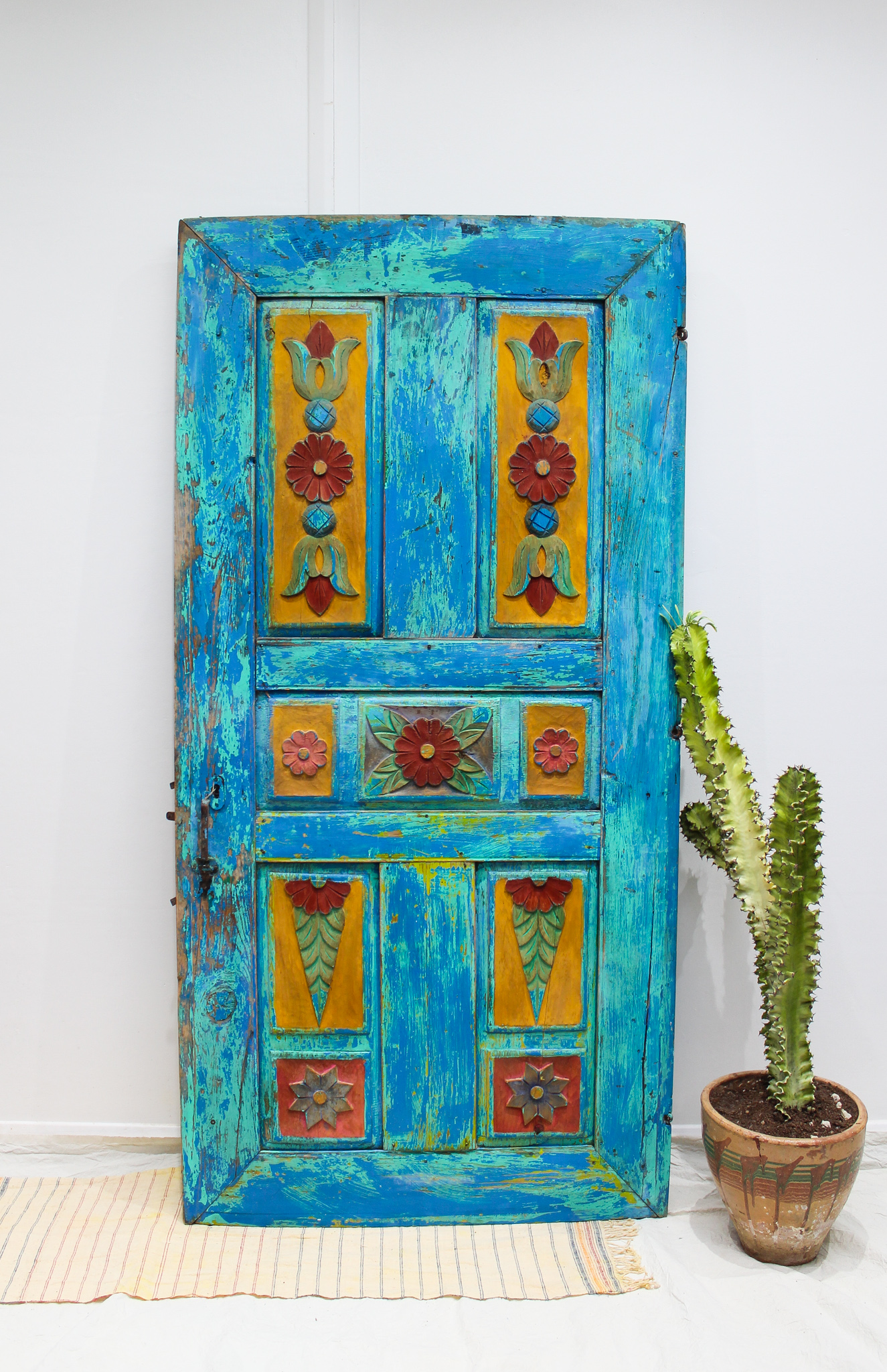 20th century hand-carved single wooden door. Intricately decorated with local Anatolian patterns and coloured with natural dyeing techniques. These doors are a great addition when used as a decorative feature – perfect as a headboard in a bedroom, for brightening up a commercial/hospitality space or simply itself as an artwork on a wall.