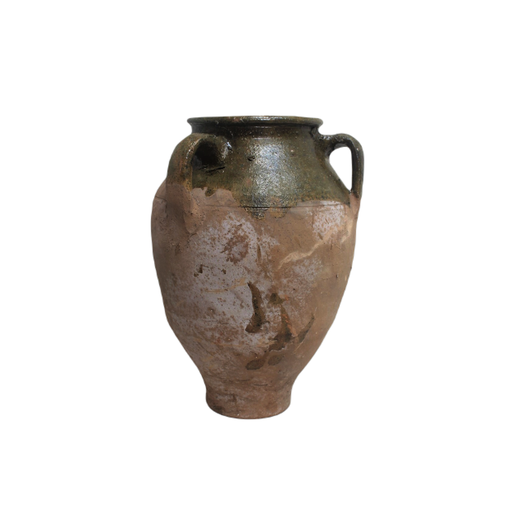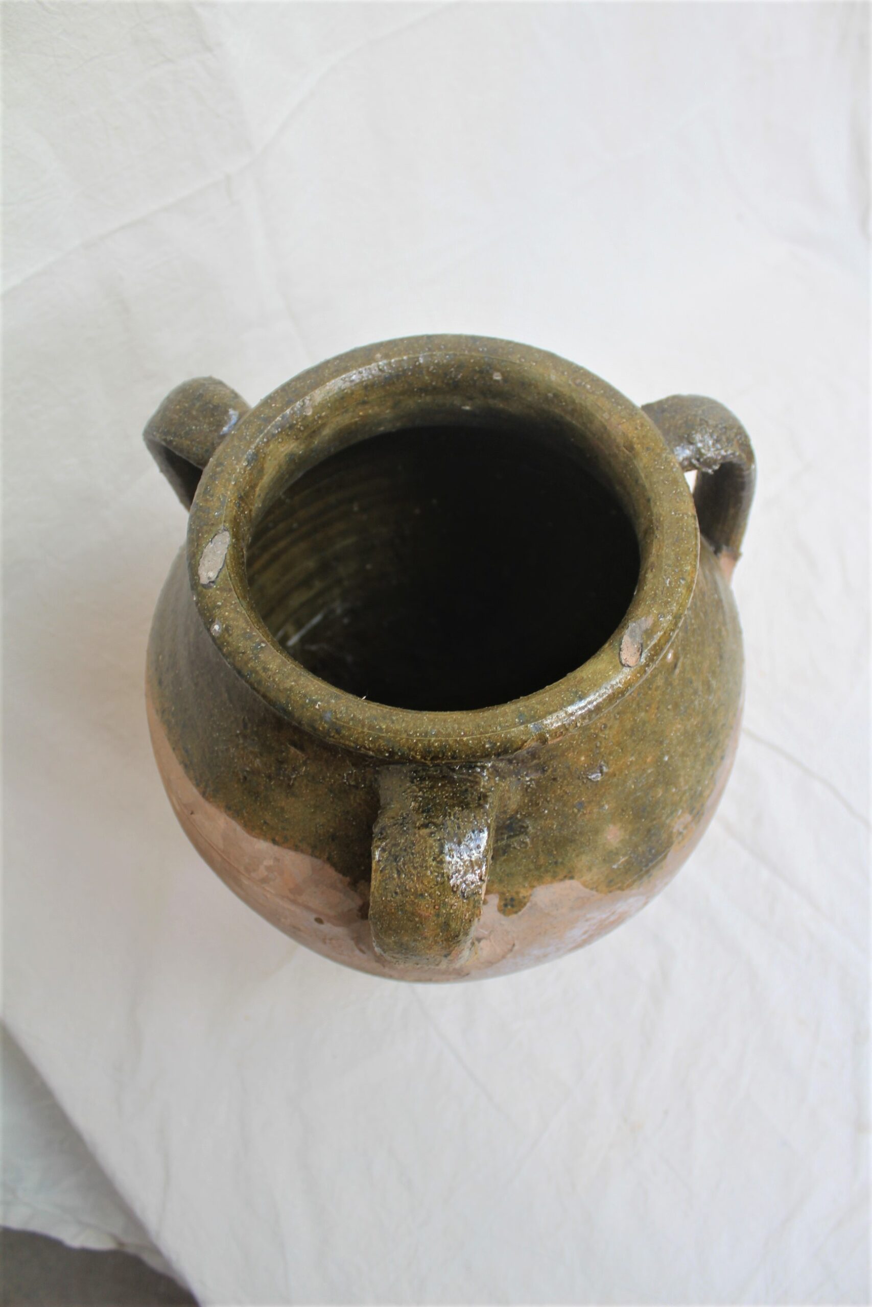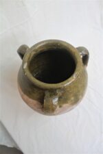 Handmade terracotta pot with three handles and brown or green glazing on it. Because of they are handmade, none of the pots are the same and you may not get the one in the photo, but we will send you a very similar one. Please let us know if you have specific requirements.