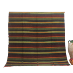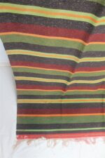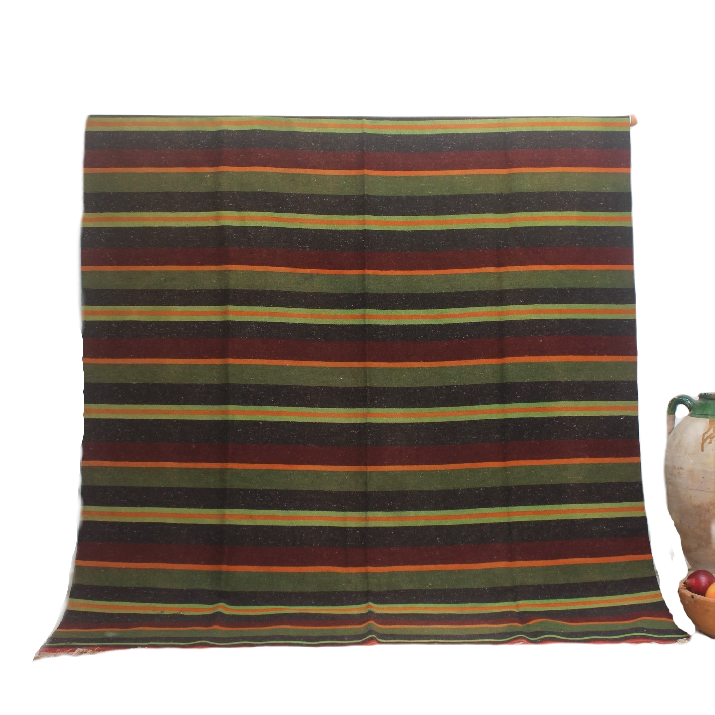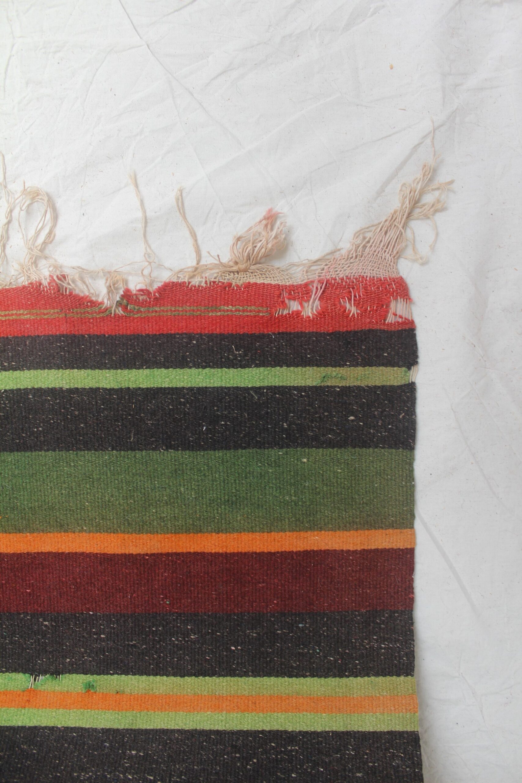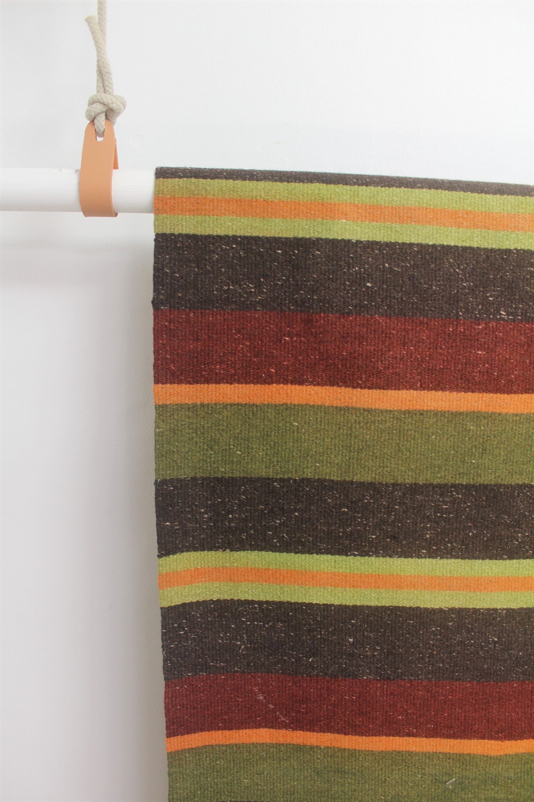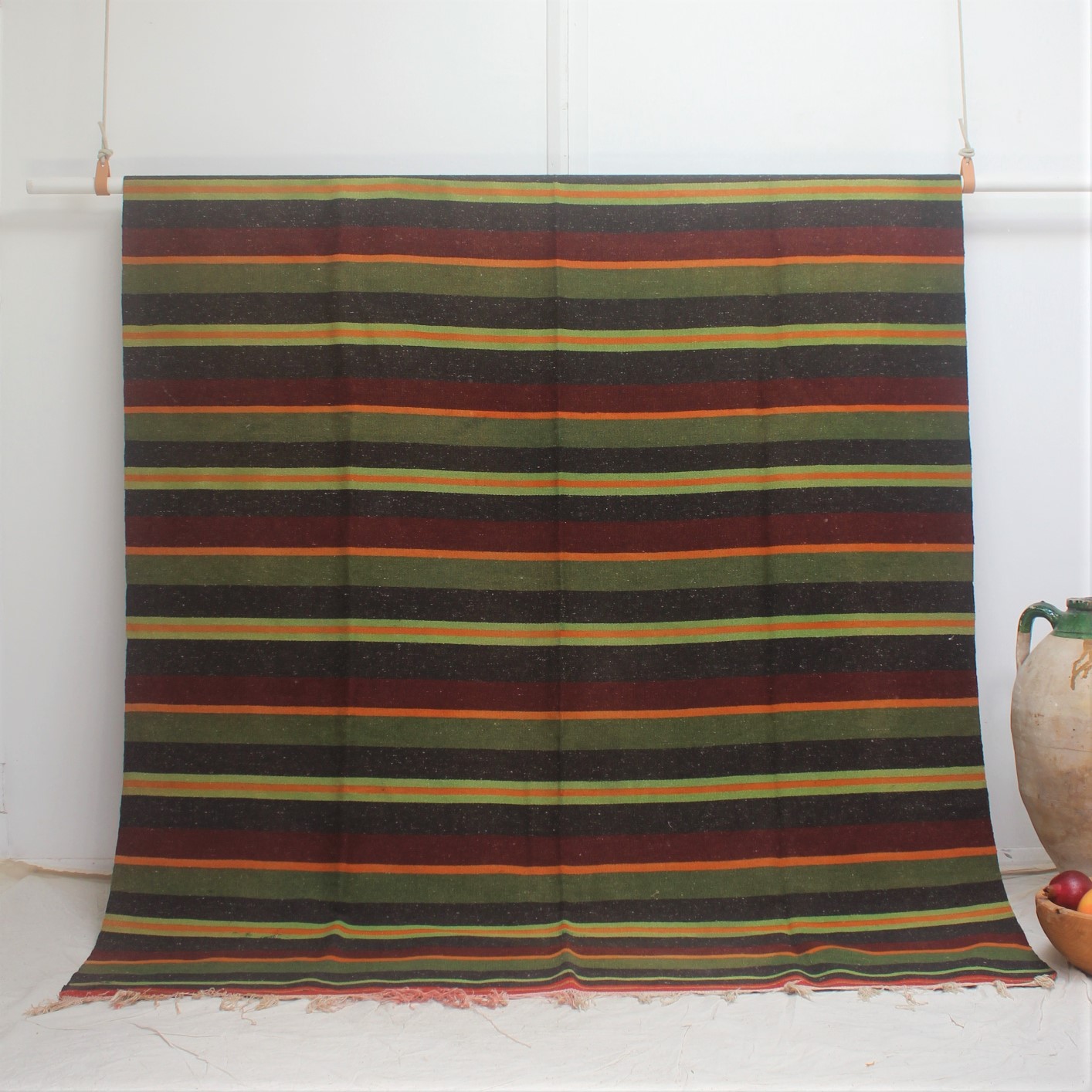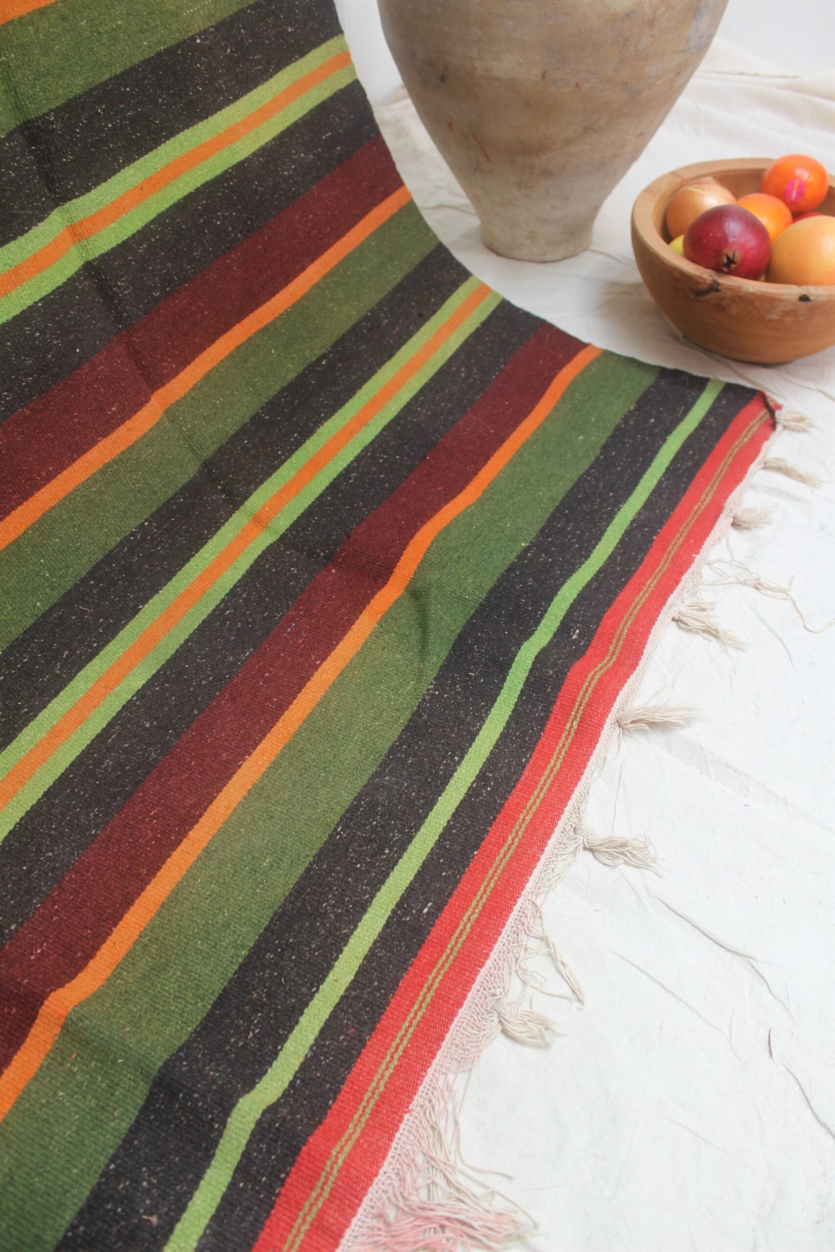 One of a kind, handmade mid-century rug with colorful unic stripe patterns. Made of wool and painted with natural dyes, it was created by using traditional methods on a weaving loom. This timeless piece will compliment any contemporary, residential and commercial space.